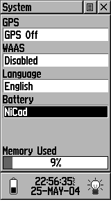 Рис. 3. Разное значение "палкомера" при одинаковом напряжении для разных типов элементов. Таким образом никель-металл гидридные аккумуляторы, с точки зрения данного навигатора, обладают наиболее большим запасом энергии при одинаковом напряжении на элементах. Это соответствует истине, так как NIMH аккумуляторы на самом деле более энергоёмки по сравнению со многими другими. Немного отходя от темы аккумуляторов скажу, что купив хорошие щелочные батарейки типа Alkaline или другие, всегда ставьте тип источника питания в навигаторе в соответствии с его реальным типом. Это даст возможность полностью "выбрать" всё, что могут выдать эти элементы. Основные режимы работы навигаторов GPS Теперь подходим к самому выбору. Для этого разберём типичные режимы использования навигатора GPS. Режим 1. Самый тяжёлый для аккумуляторов. Используется когда навигация идёт в непрерывном режиме. С включёнными режимами отображения карты, записи трека, постоянно включенным приёмником данных со спутников, периодической подсветкой, высотомером и электронным компасом. Применяется сравнительно редко, так как необходимость в постоянном тотальном контроле за собственным передвижением возникает сравнительно редко. Обычно используется при первом прохождении нового пути, который в последствии должен часто использоваться. Или на судах при прохождении сложных участков фарватера. Представить себе человека, идущего по лесу и при этом непрерывно смотрящего только на дисплей навигатора, довольно сложно. Да и противопоказано таким "туристам" выбираться на волю. Для их же безопасности. Режим 2. Режим "средней тяжести". Все перечисленные функции используются, но только в течение небольших промежутков времени. Применяется для "зарисовки" или контроля за прохождением отдельных участков пути. Когда нужно не пропустить поворот, найти сеть на озере, прописать путь в гористой или заболоченной местности и т.п. Этот режим, в определённых обстоятельствах, полностью оправдан и периодически используется всеми опытными пользователями навигаторов. Длительность в таком режиме работы различно, но в среднем, составляет 0,5 - 1час. Перерывы между включениями от 0,5 до 2 часов. Режим 3. Режим периодического использования. Самый распространённый режим. Задачи, которые решаются в данном режиме, используются постоянно всеми пользователями. Используемые функции при этом самые простые - поставить точку, определить своё текущее местоположение, определить нужное направление движения. Этого, для опытного человека, бывает достаточно в 95% случаев. Как правило, важно знать общее направление, а уж как именно добраться до цели обычно определяет сама дорога. В таком режиме навигатор находится во включенном состоянии не более 5-10мин. Этого вполне хватит для определения своего текущего местоположения или для создания отметки в виде путевой точки. После этого следующее включение может произойти только по прошествии значительного времени - от 1 до 5 часов. А может и вообще не понадобится в течение одного похода.