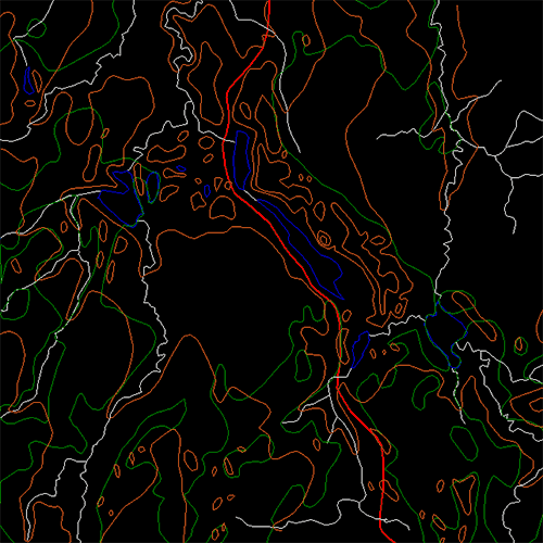 Я специально не привожу полный перечень всех инструментов. Большинство из них достаточно привычны, а остальные снабжены хорошими подсказками. Но давайте вернёмся к нашей работе. Мы сейчас должны работать с растровым слоем. Он у нас пока один. Выберем его, как было описано выше. Чтобы не загромождать статью описанием каждого инструмента, давайте приступим к практической работе. Определим цель. Допустим целью будет получение векторных лесов, озёр и горизонталей (см. примечание 2), изображённых на нашем растре. Сначала займёмся горизонталями. Почему именно ими? Например потому, что работа по их ручной векторизации достаточно однообразна и неинтересна. Очень не многие наносят на свои карты линии горизонталей. Вместе с тем, горизонтали несут достаточно важную информацию о высотах и рельефе. Поэтому давайте сначала отработаем технологию векторизации именно на них. Перейдём на растровый слой. Свидетельством этого будут инструменты для обработки растра - см.выше. Допустим, наше изображение выглядит так:
