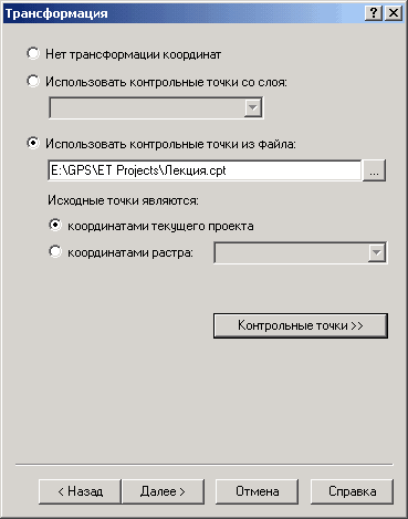 Как Вы видите, в этом окне можно посмотреть и задать тип объектов, содержащихся к каждом из выбранных слоёв. Если Вы раньше установили соответствующий тип в менеджере слоёв, то нужный тип будет выставлен автоматически. А вот в следующем окне, мы будем привязывать наши данные. Это окно "Трансформация".